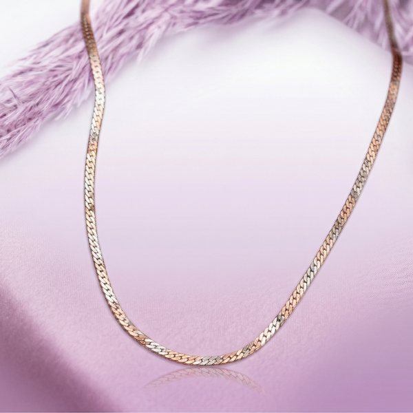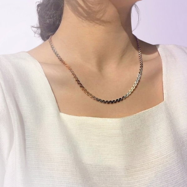 This stunning necklace features a gradient of colors reminiscent of a breathtaking sunset, transitioning from gold to silver.
